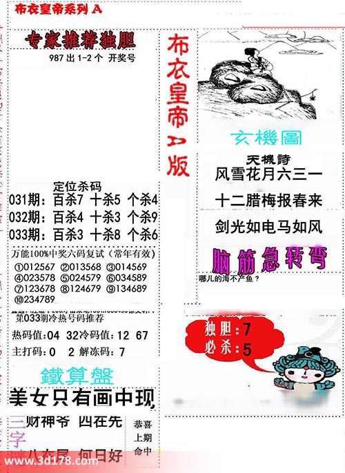 福彩3d第2017033期布衣皇帝A版布衣专家独家推荐: