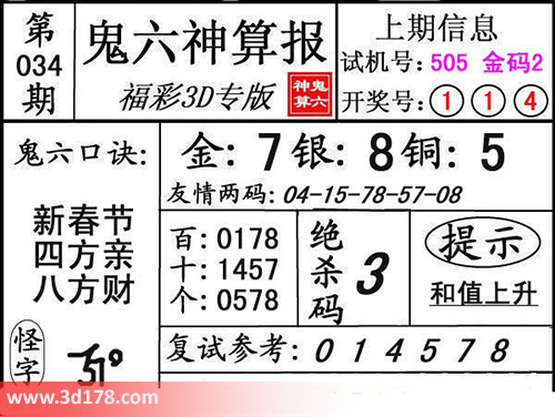 本期3d鬼六图库精解如下:新春节,四方亲,八方财