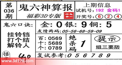 3d第17036期鬼六神算报为您推荐鬼六口诀:本期3d鬼六图库精解如下:复式参考:056789金胆:0,银胆:9,铜胆:5定位复式:百位:0569十位:5689个位:0789绝杀码:1友情两码:05-56-68-59-09该鬼六图库由3d之家3d图库频道原创,仅供彩民参考,温馨提供。