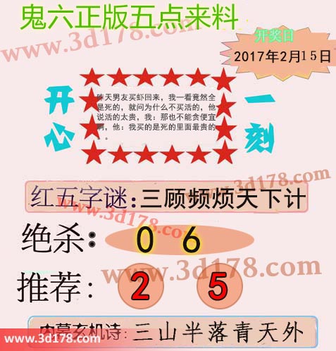 福彩3d第2017039期鬼六五点来料:3d鬼六五点来料详解第2017039期:字谜:三顾频烦天下计绝杀:0 6两胆码推荐:2 5内幕玄机诗:三山半落青天外该鬼六图库由3d之家3d图库频道原创,仅供彩民参考,温馨提供。
