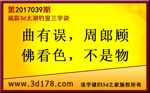 第17039期3d太湖字谜解太湖钓叟三字诀: