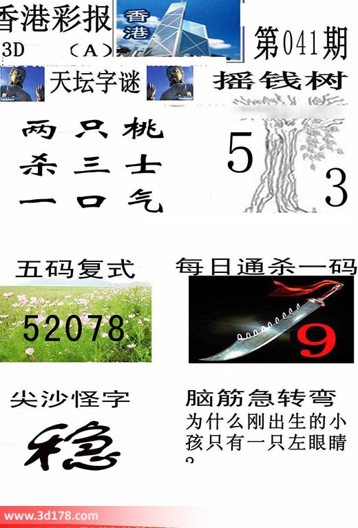 3d香港彩报第17041期摇钱树:本期3d香港彩报图详情如下:天坛字谜:两只桃,杀三士,一口气摇钱树:5 3五码复式:02578每日通杀一码:9脑筋急转筋:为什么刚出生的小孩只有一只左眼睛?该香港彩报由3d之家3d图库频道原创,仅供彩民参考,温馨提供。