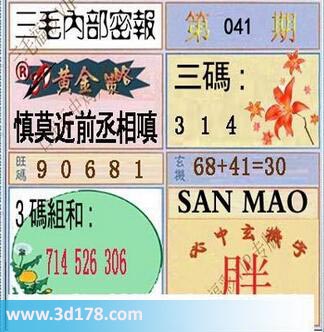 福彩3d第041期三毛内部密报综合推荐如下:3d之家三毛图库第17041期三毛内部密报图详解:黄金策略:慎莫近前丞相嗔三码:134旺码:016893码组合:714 526 306玄机:68+41=30该三毛内部密报图库由3d之家3d图库频道原创,仅供彩民参考,温馨提醒。