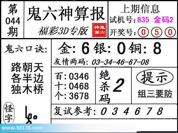 3d第17044期鬼六神算报为您推荐鬼六口诀: