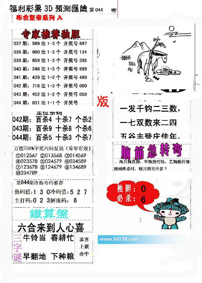 福彩3d第2017044期布衣皇帝A版布衣专家独家推荐: