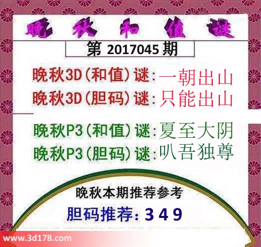 晚秋3D(和值)谜:一朝出山