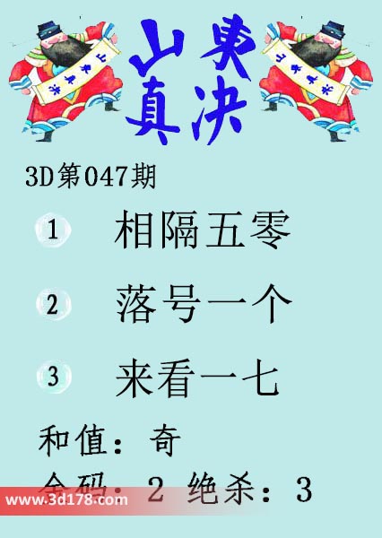 福彩3d第17047期山东真诀图如下所示:3d第2017047期山东真诀图金码推荐:1、相隔五零2、落号一个3、来看一七和值:奇金码:2 绝杀:3该丹东图库由3d之家3d图库频道原创,仅供彩民参考,温馨提供。