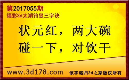 第17055期3d太湖字谜解太湖钓叟三字诀:状元红,两大碗,碰一下,对饮干
