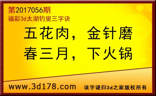 第17056期3d太湖字谜解太湖钓叟三字诀:五花肉,金针磨,春三月,下火锅
