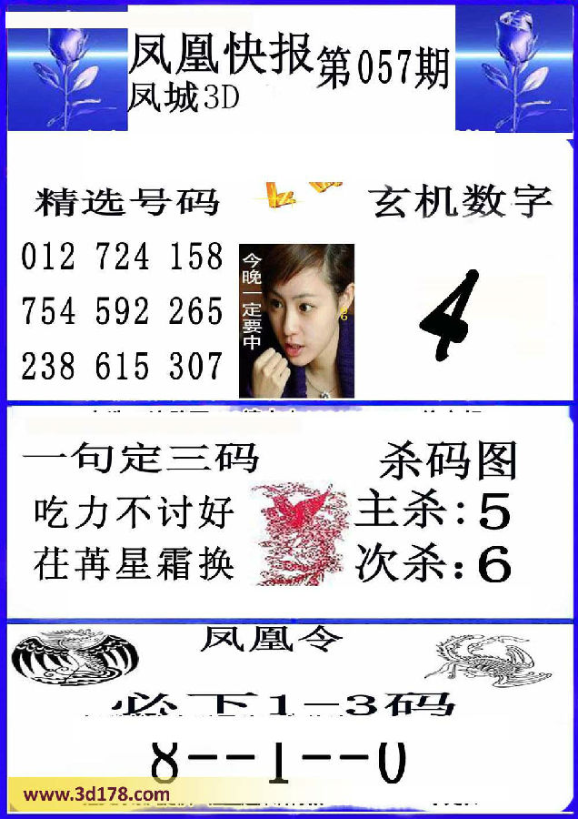 福彩3d凤凰快报图第17057期精选号码推荐: