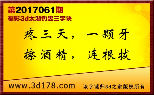 第17061期3d太湖字谜解太湖钓叟三字诀:疼三天,一颗牙,擦酒精,连根拔