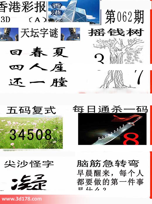3d香港彩报第17062期摇钱树:本期3d香港彩报图详情如下:天坛字谜:曰春夏,四人座,还一膛摇钱树:7 3五码复式:03458每日通杀一码:8脑筋急转筋:早晨醒来,每个人都要做的第一件事是什么?该香港彩报由3d之家3d图库频道原创,仅供彩民参考,温馨提供。