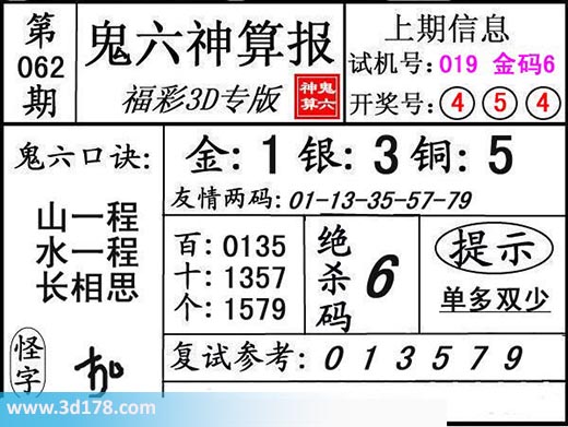 3d第17062期鬼六神算报为您推荐鬼六口诀:本期3d鬼六图库精解如下:复式参考:013579金胆:1,银胆:3,铜胆:5定位复式:百位:0135十位:1357个位:1579绝杀码:6友情两码:01-13-35-57-79该鬼六图库由3d之家3d图库频道原创,仅供彩民参考,温馨提供。