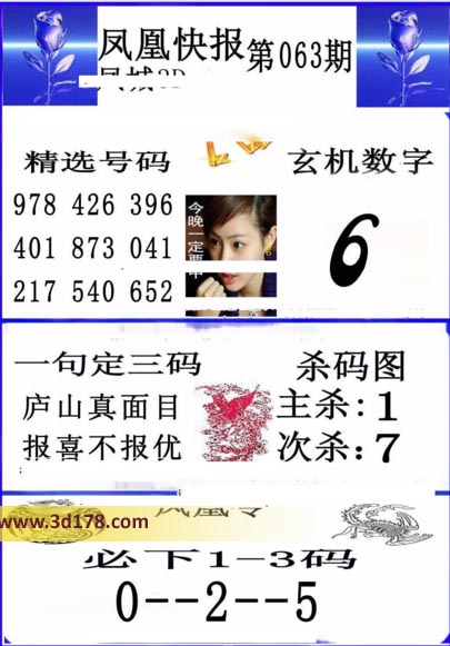 福彩3d凤凰快报图第17063期精选号码推荐: