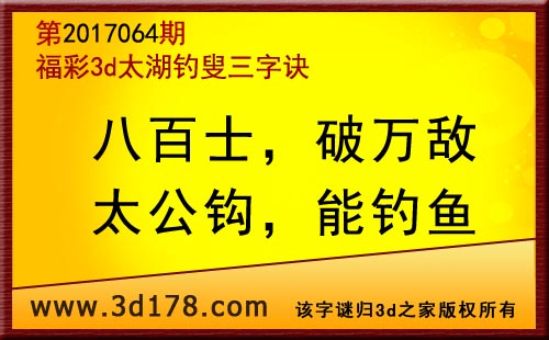 第17064期3d太湖字谜解太湖钓叟三字诀:八百士,破万敌,太公钩,能钓鱼