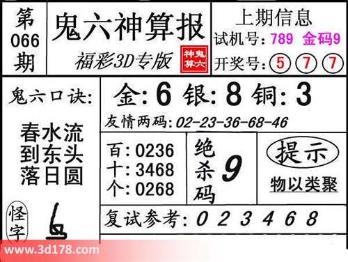 3d第17066期鬼六神算报为您推荐鬼六口诀: