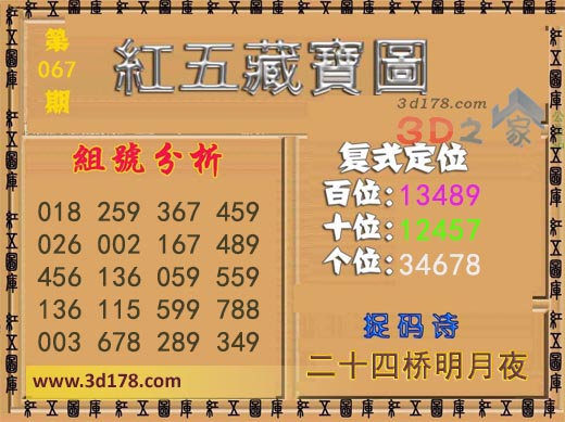 红五藏宝图3d第2017067期:福彩3d第2017067期红五藏宝图:复式定位:百位:13489十位:12457个位:34678捉码诗:二十四桥明月夜组号分析:018 259 367 459 026 002 167 489 456 136 059 559 136 115 599 788003 678 289 349红五图库由3d之家3d图库频道原创,仅供彩民参考,温馨提供。