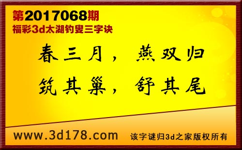 3d第17068期太湖字谜:春三月,燕双归,筑其巢,舒其尾