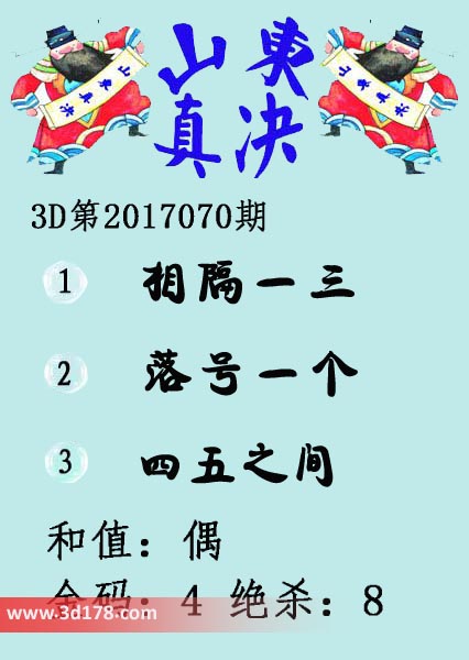 福彩3d第17070期山东真诀图如下所示:3d第2017070期山东真诀图金码推荐:1、相隔一三2、落号一个3、四五之间和值:偶金码:4 绝杀:8该丹东图库由3d之家3d图库频道原创,仅供彩民参考,温馨提供。