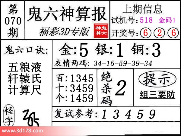 3d第17070期鬼六神算报为您推荐鬼六口诀:本期3d鬼六图库精解如下:复式参考:13459金胆:5,银胆:1,铜胆:3定位复式:百位:1345十位:3459个位:1459绝杀码:2友情两码:34-15-59-39-34该鬼六图库由3d之家3d图库频道原创,仅供彩民参考,温馨提供。