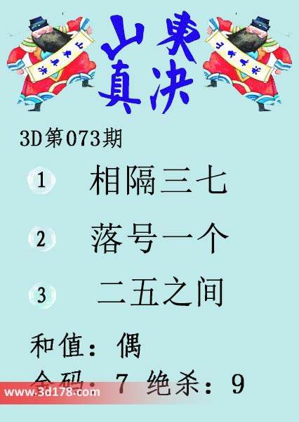 福彩3d第17073期山东真诀图如下所示:3d第2017073期山东真诀图金码推荐:1、相隔三七2、落号一个3、二五之间和值:偶金码:7 绝杀:9该丹东图库由3d之家3d图库频道原创,仅供彩民参考,温馨提供。