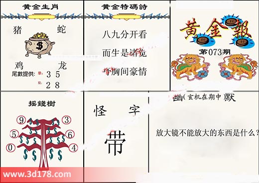福彩第17073期3d黄金报黄金特码:3d之家第073期黄金报详解:黄金特码诗:八九分布看,而生是诸觉,抒胸间豪情。黄金生肖:猪蛇鸡龙尾数推荐:单:3 5 双:2 8摇钱树推荐号码:950 364怪字:带幽默(玄机在其中):放大镜不能放大的东西是什么?黄金报图由3d之家3d图库频道原创,仅供彩民参考,温馨提供。
