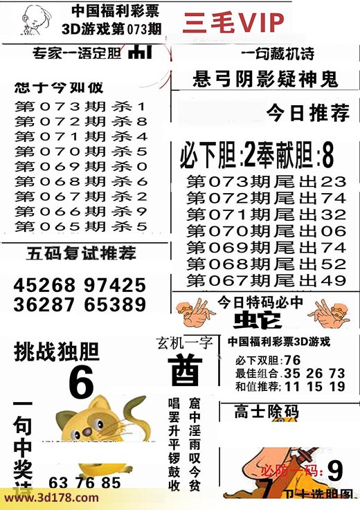 福彩3d第2017073期三毛VIP:3d第2017073期三毛VIP详解:一句藏机诗:悬弓阴影疑神鬼第2017073期挑战独胆:6必下胆:2 奉献胆:8五码复式推荐:45268 97425 36287 65389今日特码必中:蛇最佳组合:35 26 73和值推荐:11 15 19玄机一字:酋一句中奖诗:窟中淫雨叹今贫,唱罢升平锣鼓收。该三毛玄机解码图由3d之家3d图库频道原创,仅供彩民参考,温馨提供。