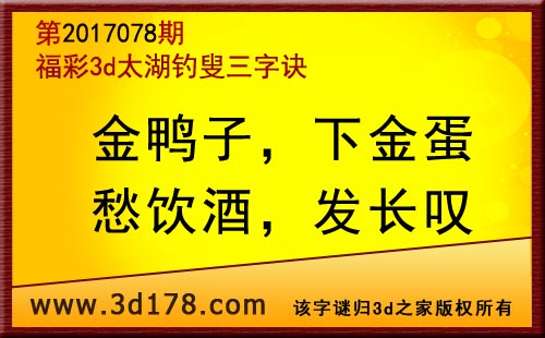 3d第17078期太湖字谜:金鸭子,下金蛋,愁饮酒,发长叹
