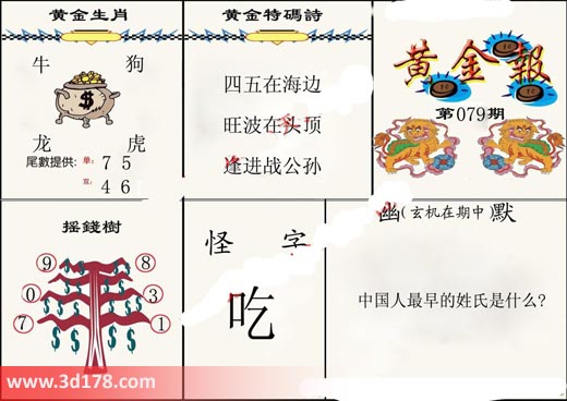 福彩第17079期3d黄金报黄金特码:3d之家第079期黄金报详解:黄金特码诗:四五在海边,旺波在头顶,逢进战公孙黄金生肖:牛狗龙虎尾数推荐:单:7 5 双:4 6摇钱树推荐号码:907 831怪字:吃幽默(玄机在其中):中国人最早的姓氏是什么?黄金报图由3d之家3d图库频道原创,仅供彩民参考,温馨提供。