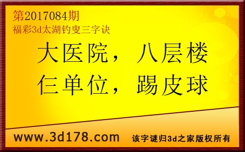 3d第17084期太湖字谜:大医院,八层楼,仨单位,踢皮球福彩3d第2017084期太湖图库解析:大医院,比较大的医院,解3有1;八层楼,有八层楼高,看1解8;仨单位,三个单位,解3防5;踢皮球,都推卸责任,防0看5;六码复式:013568精选10注:013 135 356 358 568 014 016 036 037 1283d太湖图库由3d之家3d图库频道原创,仅供彩民参考,温馨提供。