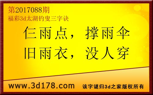 3d第17088期太湖字谜:仨雨点,撑雨伞,旧雨衣,没人穿福彩3d第2017088期太湖图库解析:仨雨点——雨点比较小,解3有0;撑雨伞——撑着雨伞,防1看7;旧雨衣——旧得雨衣,杀9;没人穿——都没有人穿,解2看5;六码复式:012357精选10注:012 123 124 158 036 357 458 025 068 0173d太湖图库由3d之家3d图库频道原创,仅供彩民参考,温馨提供。