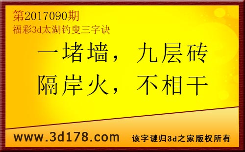 3d第17090期太湖字谜:一堵墙,九层砖,隔岸火,不相干福彩3d第2017090期太湖图库解析:一堵墙,有一堵墙,解1有7;九层砖,用九层砖砌的,看9解0;隔岸火,隔岸光火,解4防2;不相干,一点都不想干,看0有5;六码复式:012479精选10注:023 234 158 247 249 479 019 124 127 1293d太湖图库由3d之家3d图库频道原创,仅供彩民参考,温馨提供。
