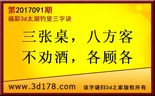 3d第17091期太湖字谜:三张桌,八方客,不劝酒,各顾各