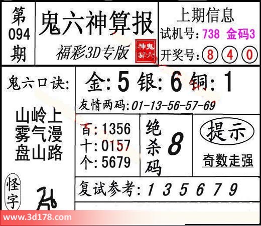 3d第17094期鬼六神算报为您推荐鬼六口诀: