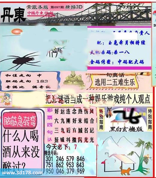 3d之家第2017097期丹东快报图:3d第2017097期丹东快报图详解:超级配:玉兔奔月相持续天机杀码:杀一八和值走向:中胆码走向:183奇偶比:偶奇偶金码传密:中码配大码精选号码:301 246 579 846 751 862 953 843 950 046 379 969脑筋急转弯:什么人喝酒从来没醉过?该丹东图库由3d之家3d图库频道原创,仅供彩民参考,温馨提供。
