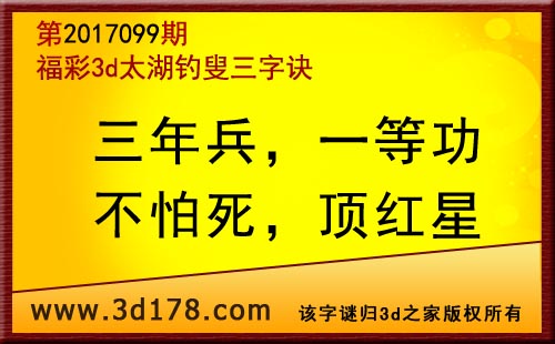 3d第17099期太湖字谜:三年兵,一等功,不怕死,顶红星