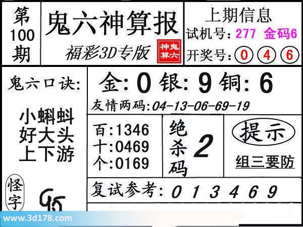 3d第17100期鬼六神算报为您推荐鬼六口诀: