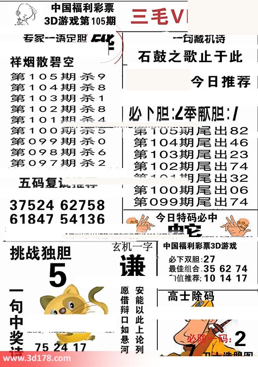 福彩3d第2017105期三毛VIP:3d第2017105期三毛VIP详解:一句藏机诗:石鼓之歌止于此。第2017105期挑战独胆:5必下胆:2 奉献胆:7五码复式推荐:37524 62758 61847 54136今日特码必中:蛇最佳组合:35 62 74和值推荐:10 14 17玄机一字:谦一句中奖诗:安能以此上论列,愿借辩口如悬河该三毛玄机解码图由3d之家3d图库频道原创,仅供彩民参考,温馨提供。