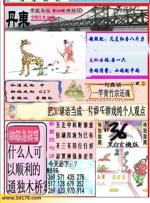 3d之家第2017105期丹东快报图:3d第2017105期丹东快报图详解:超级配:几支红杏八斤力天机杀码:杀一六和值走向:中胆码走向:617奇偶比:奇偶偶金码传密:小码配中码精选号码:369 571 435 278 517 128 679 352 269 620 970 914脑筋急转弯:什么人可以顺利的通独木桥?该丹东图库由3d之家3d图库频道原创,仅供彩民参考,温馨提供。