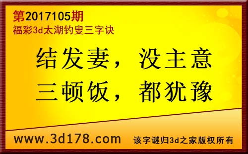 3d第17105期太湖字谜:结发妻,没主意,三顿饭,都犹豫