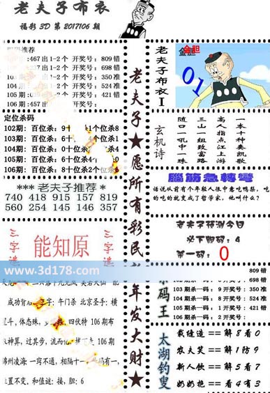 福彩3d第2017106期老夫子布衣图详情:106期:457 出1-2个 开奖号:106期:百位杀8 十位杀2 个位杀6老夫子精选推荐:740 418 915 157 819 560254 145 146 357老夫子预测今日必下胆码4,杀一码0脑筋急转弯:话说从前有个年轻人很中意吃鸭梨,吃的吃的就变成了哲学家,他叫什么?该布衣图库由3d之家3d图库频道原创,仅供彩民参考,温馨提供。