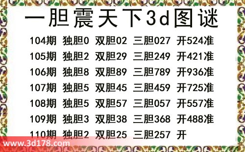 福彩3d第17110期一胆震天下三胆图:本期一胆震天下3d图谜104期 独胆0 双胆02 三胆027 开524准105期 独胆2 双胆29 三胆249 开421准106期 独胆8 双胆89 三胆789 开936准107期 独胆5 双胆45 三胆459 开725准108期 独胆5 双胆57 三胆057 开557准109期 独胆3 双胆38 三胆368 开488准110期 独胆2 双胆25 三胆257 开一胆震天下三胆图库由3d之家3d图库频道原创,仅供彩民参考,温馨提供。