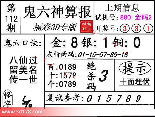 3d第17112期鬼六神算报为您推荐鬼六口诀: