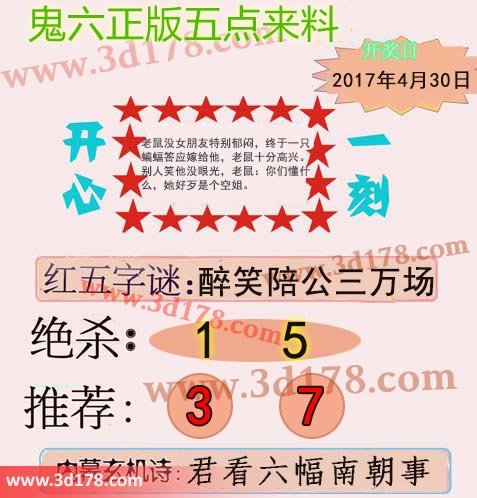 3d鬼六五点来料详解第2017113期:字谜:醉笑陪公三万场