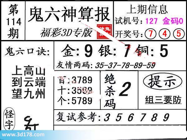 3d第17114期鬼六神算报为您推荐鬼六口诀: