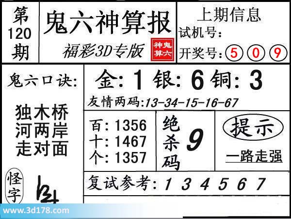 3d第17120期鬼六神算报为您推荐鬼六口诀: