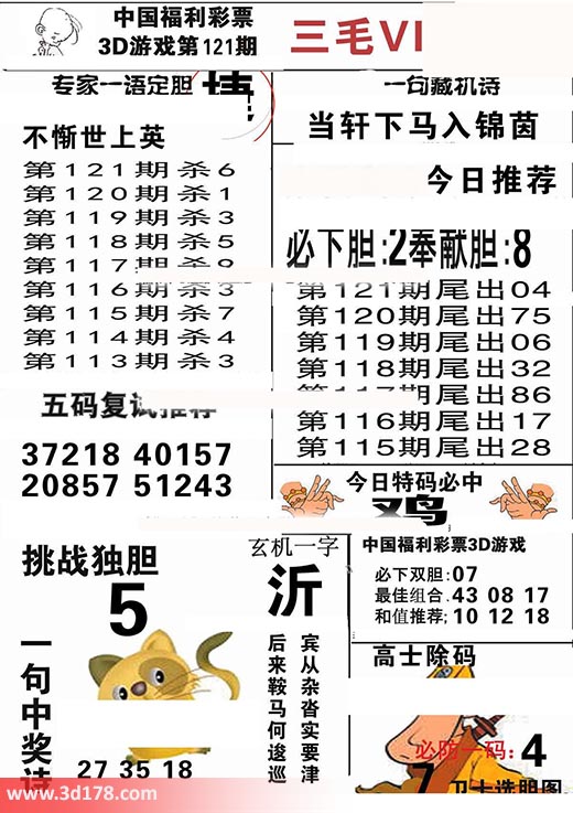 福彩3d第2017121期三毛VIP:3d第2017121期三毛VIP详解:一句藏机诗:当轩下马入锦茵。第2017121期挑战独胆:5必下胆:2 奉献胆:8五码复式推荐:37218 40157 20857 51243今日特码必中:鸡最佳组合:43 08 17和值推荐:10 12 18玄机一字:沂一句中奖诗:宾从杂沓实要津 后来鞍马何逡巡该三毛玄机解码图由3d之家3d图库频道原创,仅供彩民参考,温馨提供。