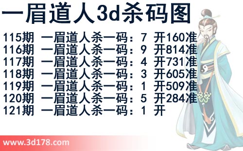 福彩3d第2017121期一眉道人杀码图:一眉道人往期回顾:115期 一眉道人杀一码:7 开160准116期 一眉道人杀一码:9 开814准117期 一眉道人杀一码:4 开731准118期 一眉道人杀一码:3 开605准119期 一眉道人杀一码:1 开509准120期 一眉道人杀一码:5 开284准121期 一眉道人杀一码:1 开该一眉道人3d杀码图由3d之家3d图库频道原创,仅供彩民参考,温馨提供。
