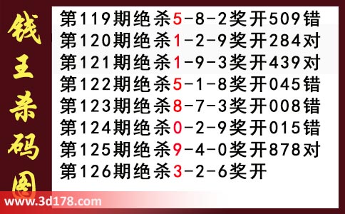 第2017126期3d钱王杀码图杀号推荐分析:近期3d钱王杀码具体详情:第119期绝杀5-8-2奖开509错第120期绝杀1-2-9奖开284对第121期绝杀1-9-3奖开439对第122期绝杀5-1-8奖开045错第123期绝杀8-7-3奖开008错第124期绝杀0-2-9奖开015错第125期绝杀9-4-0奖开878对第126期绝杀3-2-6奖开该钱王杀码图由3d之家3d图库频道原创,仅供彩民参考,温馨提供。