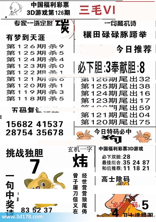 福彩3d第2017126期三毛VIP:3d第2017126期三毛VIP详解:一句藏机诗:穰田碌碌豚蹄举。第2017126期挑战独胆:7必下胆:3 奉献胆:8五码复式推荐:15682 41537 28754 35678今日特码必中:狗最佳组合:35 24 87和值推荐:11 18 21玄机一字:炜一句中奖诗:经世营营狼尾俦 曾子屠刀信义在该三毛玄机解码图由3d之家3d图库频道原创,仅供彩民参考,温馨提供。
